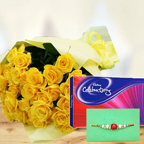 Show your warmth love in the best way with our beautiful and adorable bouquet of 15 Yellow Roses wrapped in cellophane and be ready to get applauds every single time! Pair it with a beautiful designer pearl rakhi and Cadbury Celebrations Pack (118 gm), to surprise your brother even more on Raksha Bandhan. Complimentary Roli, Tikka & Chawal (Included).