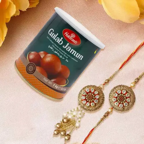 Convey your deepest love for your dear ones this Raksha Bandhan by ordering this Premium Bhaiya Bhabhi Rakhi Set with Gulab Jamun packed with your good wishes along with free Roli, Tilak and Chawal. This rakhi gift hamper has: