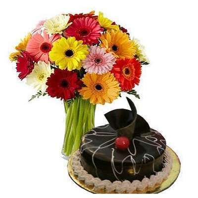 Its a bunch of 10 Mix Gerbera Flowers and half kg chocolate cake.